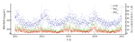 (2)环境监测资料:2011年1月1日至2014年12月31日环境监测资料来源于宁波市环境监测中心,包括PM2.5、粒径≤10 μm的颗粒物(PM10)、NO2及SO2的日平均浓度。