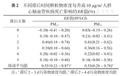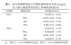 在单污染物模型的基础上,分别纳入SO2及NO2,拟合多污染物模型显示,PM2.5纳入其他污染物后ER值无统计学意义。PM10纳入SO2后ER值无统计学意义,PM10纳入PM2.5及NO2后ER值有所变化,均有统计学意义。见表3。