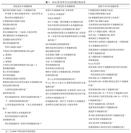 2016年版WHO淋巴瘤分类在2008年版的基础上增加了一些新类型并对某些种类作了更名(表1)。