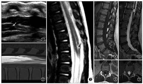 超声是诊断胎儿或新生儿第五脑室的一种常用检查方法[12](图1,图2,图3)。第五脑室在超声矢状切面图上显示为脊髓圆锥区域囊状扩张的低回声区并可与中央管相通,在超声横断切面图上表现为扩张的低回声囊腔且与周围脊髓组织有着较为清楚的分界。MR检查为诊断第五脑室的主要手段。第五脑室在MRI上通常表现为脊髓圆锥内边缘清楚的卵圆形囊腔,形态规则,囊壁光整,且与周围正常的脊髓组织分界清楚,囊内为T1WI低(图4,图5)、T2WI(图6,图7)高的脑脊液信号,囊内分隔及囊周水肿性改变比较少见,增强扫描后囊壁不强化。第五脑室需要与位于脊髓圆锥的囊性肿瘤如室管膜瘤、星形细胞瘤以及脓肿相鉴别,囊性肿瘤和脓肿的囊壁通常有不同程度的强化。脊髓圆锥的转移瘤很少见,MRI表现通常为肿瘤强化且周围伴有明显水肿[13]。脊髓背侧的严重损伤也可发展为囊性病灶,但目前报道的大多数第五脑室病例并无外伤病史[6]。脊髓内的表皮样囊肿和皮样囊肿由于成分复杂导致MRI表现多变[14],而第五脑室的MRI表现单一。