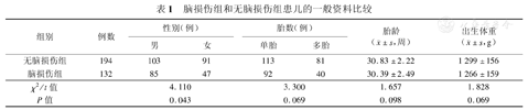 无脑损伤组和脑损伤组患儿除性别外,胎数、出生体重、胎龄比较差异无统计学意义(P>0.05),见表1。