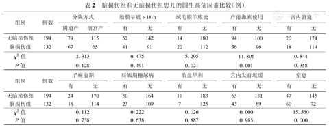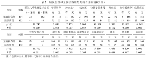 脑损伤组和无脑损伤组患儿的围生高危因素比较(例)