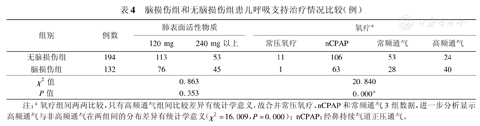 脑损伤组和无脑损伤组患儿呼吸支持治疗情况比较(例)