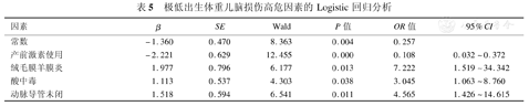按纳入标准将性别、窒息、产前激素使用、绒毛膜羊膜炎、NRDS、呼吸暂停、肺出血、酸中毒、动脉导管未闭、低碳酸血症、低氧血症、高血糖、贫血、低血压、高频通气、血小板减少和宫外发育迟缓共17个高危因素进一步进行二分类 Logistic回归分析,剔除值默认为0.05,最终显示4个变量进入最佳回归方程,结果提示产前激素使用与脑损伤发生呈负相关,绒毛膜羊膜炎、酸中毒和动脉导管未闭与脑损伤发生呈正相关,早产儿脑损伤的危险分别增加了0.108、7.222、3.045和4.565倍,见表5。