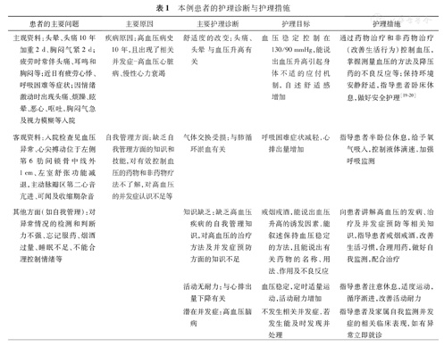 | 主观资料:头晕、头痛10年加重2 d、胸闷气紧2 d;疲劳时常伴头痛、耳鸣和胸闷等;近日有疲劳心悸、呼吸困难等症状;因情绪激动时出现头痛、烦躁、眩晕、恶心、呕吐,胸闷气急及视力模糊等入院 | 疾病原因:高血压病史10年,且出现了相关并发症高血压心脏病、慢性心力衰竭 | 舒适度的改变:头痛、头晕与血压升高有关 | 血压稳定控制在130/90 mmHg,能说出血压升高引起身体不适的应付机制,自述舒适感增加 | 通过药物治疗和非药物治疗(改善生活行为)控制血压,掌握测量血压的方法及降压药的不良反应等;保持环境安静舒适,指导患者卧床休息,做好安全护理[19,20] |