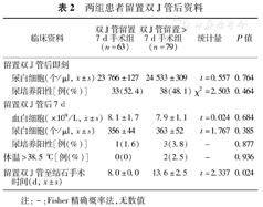 留置双J管后即刻再次行尿常规检查及尿培养,两组结果差异无统计学意义(均P>0.05)。留置双J管7 d后,再次复查血白细胞、尿白细胞,中段尿细菌培养,两组结果差异无统计学意义(均P>0.05)。B组病例中有2例患者体温控制不佳,考虑感染的脓苔造成引流梗阻,加行肾造瘘及更换新的双J管后体温得到控制(表2)。两组患者在留置双J管7 d后,血白细胞、尿白细胞、尿培养细菌阳性率均明显好转,炎症状态减轻。