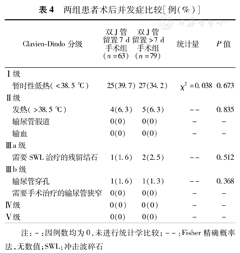 | Clavien-Dindo分级 | 双J管留置7 d手术组(n=63) | 双J管留置>7 d手术组(n=79) | 统计量 | P值 | |