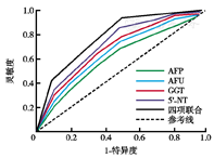 肝细胞癌(HCC)是消化系统常见的恶性肿瘤之一,居肿瘤致死病因的第3位[1,2]。其具有病程进展快、恶性程度高、预后差等特点[3]。目前临床上常用肿瘤体征、体能状况、肝功能状态等指标对HCC进行综合判断,但时效性、准确性相对较差[4]。而血清甲胎蛋白(AFP)虽然是临床上诊断及筛查HCC最常用的肿瘤标志物,但灵敏度极低[5],作为早期HCC的诊断及筛查指标并不理想[6]。α-L-岩藻糖苷酶(AFU)和γ-谷氨酰转肽酶(GGT)的表达与HCC密切相关[7],且具有较高的灵敏度,但特异度较差。而5'-核苷酸酶(5'-nucleotidase,5'-NT)在诊断HCC方面具有极高的灵敏度[8]。因血清标志物联合检测能够提高诊断的阳性率[9],故本研究旨在探讨AFP、AFU、5'-NT和GGT联合检测在HCC诊断中的临床应用。