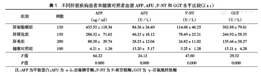 | 组别 | 例数 | AFP(ng/ml) | AFU(U/L) | 5'-NT(U/L) | GGT(U/L) |