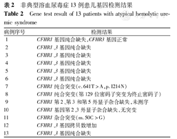 患儿基因检测结果,见表2。在13例患儿中,CFH基因均未发现突变,检出CFHR1和CFHR3基因的纯合缺失6例,包括CFHR1基因的缺失、突变和2个基因的缺失,CFHR1基因的杂合缺失,CFHR1基因的杂合突变和CFHR1、CFHR3基因拷贝数增加。