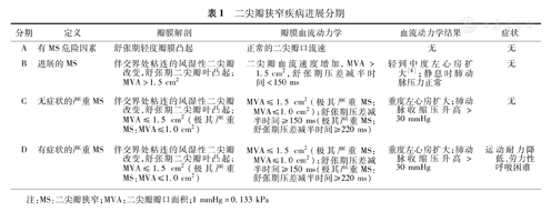 正常成人二尖瓣瓣口面积为4~6 cm2。当瓣口面积<2.0 cm2时,即发生有意义的血液动力学改变。瓣口面积减小至1.5~2.0 cm2属于轻度狭窄,1.0~1.5 cm2属于中度狭窄,瓣口面积<1.0 cm2时属于重度狭窄[6]。当严重狭窄时,左心房压需高达20~25 mmHg(1 mmHg=0.133 kPa)才能使血流通过狭窄的瓣口。升高的左心房压会导致肺静脉及肺毛细血管压升高,从而发生劳力性呼吸困难[1]。当左心房压超过30 mmHg时,出现呼吸困难、咳嗽、发绀等临床表现。值得注意的是,2014年美国心脏协会(AHA)/美国心脏病学会(ACC)心脏瓣膜病指南中并未再提出以上分级,而是根据二尖瓣瓣口面积的大小,将二尖瓣瓣口面积≤1.5 cm2定义为"严重狭窄",因为这种情况通常表示在正常心率时二尖瓣跨瓣压力梯度>5~10 mmHg。当二尖瓣瓣口面积≤1.0 cm2时则为"极其严重狭窄"。该指南同样提出了二尖瓣狭窄的疾病进展分期(表1)[7]。