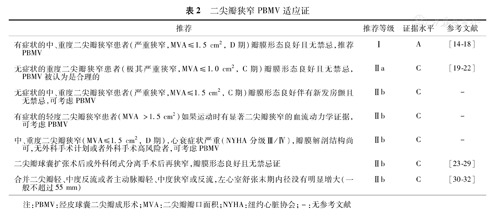 根据我国的实际情况,在国外相关指南[14,15,16,17,18,19,20,21,22,23,24,25,26,27,28,29,30,31,32]的基础上,我们修订出我国PBMV的适应证(表2)。