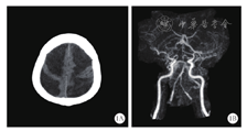 入院后静滴头孢曲松2 g、12 h 1次,万古霉素1 000 mg、8 h 1次,地塞米松12 mg、6 h 1次×3 d,并给予镇静、呼吸机辅助呼吸、脱水、抑酸、营养支持等综合治疗。弥散性血管内凝血(DIC)检测提示高凝状态,结合患者处于深度镇静,为防止下肢深静脉血栓形成加用低分子肝素抗凝,并给予阿司匹林抗血小板聚集治疗。入ICU后未再出现高热,3 d复查脑脊液仍培养出肺炎链球菌,但脑脊液常规生化指标明显好转;4 d脱机;6 d意识明显好转,格拉斯哥昏迷评分(GCS)15分,拔出气管导管;11 d转入神经内科进一步治疗,抗感染方案同前,地塞米松减至5 mg/d静滴,停用抗凝治疗;入院后12 d再次出现高热、谵妄,复查脑脊液提示细胞数、葡萄糖、微量蛋白均较前好转,但发热及谵妄症状逐渐加重至难以控制;14 d给予深度镇静并行气管插管后再次转入ICU,继续给予万古霉素抗感染,加用抗血小板聚集药物及营养支持等综合治疗;因凝血指标监测提示在正常范围内,未再加用抗凝治疗;16 d患者可完全脱机,镇静剂洗脱后患者意识恢复不理想,GCS评分8分,脑电双频指数(BIS)波动在60左右,NSE 23.04 μg/L、S100 1.040 μg/L,均明显增高,考虑存在神经系统损伤;18 d复查头颅CT示双侧大脑半球及脑干异常低密度影(图1A),头颅CT血管造影(CTA)示双侧大脑前动脉、中动脉及后动脉末梢血管显示不清,右侧大脑后动脉P1段未见显影,主要由后交通动脉代偿供血(图1B),拔管后患者咳痰能力差、舌根后坠;28 d行气管切开后彻底脱机,但患者四肢无自主活动,脑干功能保留,大脑高级皮质功能明显下降,格拉斯哥预后评分(GOS)2分,之后转入高压氧科继续康复治疗。