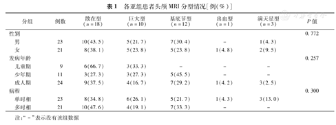各亚组患者头颅MRI分型见表1。对不同性别(P=0.772)、年龄(P=0.257)和病程(P=0.300)患者分为亚组比较,各亚组患者头颅MRI分型情况差异无统计学意义。