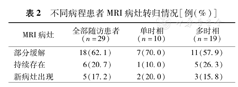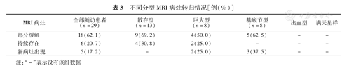 29例患者最后一次MRI检查与第一次MRI检查时间间隔(5.3±1. 9)年。其中18例(62.1%)病灶部分缓解,6例(20.7%)病灶持续存在,5例(17.2%)出现新病灶。单时相与多时相患者比较,两者头颅MRI临床转归差异无统计学意义(P=0.587)(表2)。在不同MRI分型中,病灶部分消退最多见,各种分型在随访中转归的差异无统计学意义(P=0.131)(表3)。