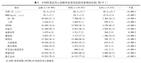 24 394例AMI患者平均年龄(62.2±13.8)岁,男18 162例(74.5%),18 209例(74.6%)为STEMI。与女性比较,男性患者平均年龄更低[(60.2±13.7)比(68.2±12.3)岁,P<0.000 1)],平均体质指数(BMI)更高[(24.2±3.0)比(23.8±3.4)kg/m2,P<0.000 1),更多存在吸烟(68.8%比12.3%,P<0.000 1)、血脂异常(7.2%比5.8%,P=0.000 2)、早发冠心病家族史(3.8%比2.3%,P<0.000 1),也更喜欢肥腻饮食(80.4%比65.0%,P<0.000 1);相对于男性患者,女性AMI患者则更多合并高血压(61.4%比46.5%,P<0.000 1)和糖尿病(24.8%比17.2%,P<0.000 1),也更缺乏运动(81.7%比77.8%,P<0.000 1)(表1)。