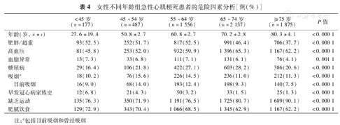 女性不同年龄组急性心肌梗死患者的危险因素分析[例(%)]
