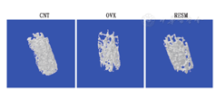 在术后第3个月,取得L5椎体进行显微CT扫描并经过3D重建获取图片以及3D显微形态计量学数据。此时,椎体内部呈圆柱体重建图片中(图1),相比于对照组CNT,实验组OVX和RESM两组的骨小梁都更为稀疏,总体数目和相互连接较少,特别是OVX骨小梁网络的疏松趋势更为明显。