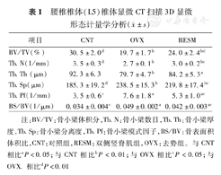 将30只20周龄、雌性SD大鼠,随机分为3组:对照组(伪手术组、双侧背部侧正中切口,CNT)、双侧竖脊肌组(切除双侧腰椎旁竖脊肌,RESM)以及去势组(切除双侧卵巢,OVX)。术后第3个月取材腰椎椎体(L4~6)依次进行骨密度、显微CT、椎体压缩实验等检测。