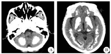 A:双侧小脑半球对称性钙化灶;B:双侧额颞枕叶、基底节区、背侧丘脑对称性钙化灶