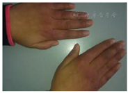 患者女性,46岁,因"肢体不灵活7年,加重伴记忆力下降1年"在2016年4月28日收治于遵义医学院附属医院神经内科。患者2009年无明显诱因被家属发现步态异常,不影响生活,未予重视,无特殊处理;2015年上述症状加重,伴记忆力下降、吐词欠清晰及姿势异常,不能胜任工作,于我院就诊,予药物治疗,症状无明显好转。2016年3月4日就诊于我科门诊行头颅CT示双侧大小脑多发钙化灶(图1),查甲状旁腺激素、甲状腺功能无异常,甲状腺球蛋白抗体:997.9 IU/mL(正常值为0~115 IU/mL)。患者为明确诊断复诊于重庆医科大学附属第一医院,复查头颅CT结果同我院,电解质及降钙素无异常(排除甲状旁腺减退症及假性甲状旁腺减退症)。患者既往体健,近期未患感冒。患者父亲75岁时出现记忆力下降、肢体活动障碍,未行相关检查,78岁时因肺部疾病去世。入院体检:心肺腹查体无明显异常,甲状腺轻度增大,双手掌指关节以远皮肤粗糙、泛红、皮温异常(图2),全身未见皮脂腺纤维素瘤及牛奶咖啡斑(排除结节性硬化症),双足内收、背伸畸形。入院神经系统体检:吐词欠清晰,记忆力下降,左侧轻度面舌瘫,双上肢肌力5-级,双下肢肌力4+级,四肢肌张力稍增高,右侧Oppenheim征、Pussep征、Chaddock征均阳性,余无明显阳性体征。入院后查双上肢血管超声提示双侧尺动脉管径偏细,左侧流速减低,右侧锁骨下动脉内中膜增厚。诊断"Fahr病"。予抗胆碱能及健脑药物等对症支持治疗。