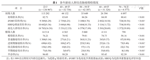 | 结直肠癌检出率(%) | 156(1.09) | 10(0.23) | 57(1.13) | 67(1.63) | 22(2.76) | <0.01a | |
