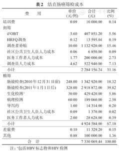 初筛成本包括iFOBT、HRFQ调查、调查者补贴和人力(社区公共卫生人员、医务工作者和调查员)成本。精筛成本包括肠镜检查、病理检查、生化检测、导泻药和人力成本。此外,培训费、差旅费以及包括水电费、办公费在内的其他费用也计入成本。间接成本中未纳入研究对象的误工费。