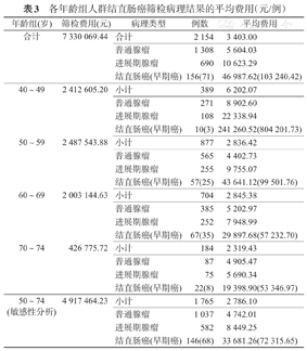 | 年龄组(岁) | 筛检费用(元) | 病理类型 | 例数 | 平均费用 |