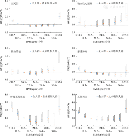 研究人群累计随访3 085 054人年(平均随访7.2年)。随访期间男性7 862人、女性6 315人死亡。多因素调整后,与BMI (kg/m2)为20.5~ 22.4的人群相比,BMI <18.5(HR= 1.40,95%CI:1.31~ 1.50)、BMI为18.5~ 20.4 (HR=1.11,95%CI:1.05~ 1.17)和BMI≥35.0 (HR = 2.05,95%CI:1.60~2.61)的人群全死因死亡风险升高。各疾病死亡风险相对较低的BMI (kg/m2)范围:缺血性心脏病为18.5~ 23.9,脑血管病为<26.0,恶性肿瘤为26.0~ 34.9,呼吸系统疾病为24.0~ 25.9。