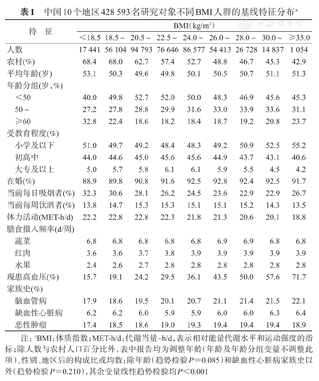 中国10个地区428 593名研究对象不同BMI人群的基线特征分布a