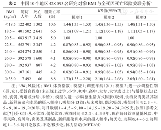 低体重和肥胖人群的全死因死亡与死因别死亡风险升高。人群队列更长期的随访以及更多关于BMI与主要慢性病发病风险的评估,将有助于全面了解BMI对人群健康的影响。