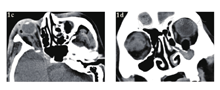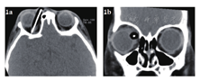 急诊入院者16例,均行眼眶CT检查,其中6例患者发现异物影(37.5%),发现异物影者主要为铅笔或筷子类异物(图1a、b),而竹子类异物较难发现,多表现为絮状密度影等感染征象、不能显示明显异物影(图1c、d);早期入院者7例,均行眼眶CT检查,其中4例发现异物影(57.1%),表现为条状或片状低密度影,周围伴软组织密度影(图2);中晚期入院者19例,4例在外院行了眼眶CT外余均在我院行眼眶CT检查,其中16例扫描表现为高密度条索状或片状异物影(84.2%),大部分能显出异物大致轮廓,周围多伴有软组织密度影(图3)。
