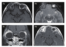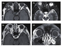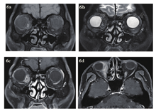 急诊入院者16例,6例患者行了MRI检查,主要为CT发现絮状密度影等感染征象、未发现异物影的,2例MRI发现异物影(图4a~d)。早期入院者7例,5例行了MRI检查(包括3例CT未发现异物的患者),其中3例发现异物影。其主要表现为:T1WI呈等信号或低信号,T2WI呈等信号,增强时中央无强化影,周边强化(图5a~d);中晚期入院者19例,16例行了眼眶MRI检查(未行MRI检查的为CT明确发现异物的)。其中15例患者发现异物影(93.8%),主要表现为:T1WI呈低信号,T2WI呈等信号或混杂高信号表现,增强时多表现为病灶中央无强化影(异物,不强化),周边明显强化(冠状位的典型表现为环状增强)(图6a~d)。