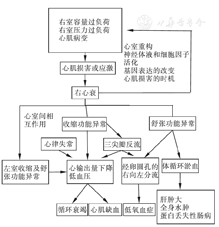 急性右室后负荷增加使舒张末右室及右房压力升高,造成体循环液体潴留,引起肝肾及胃肠道功能异常。同时右室腔扩大继发三尖瓣反流,进一步增加右室容量负荷并减少心搏出量。两者均引起心房水平经卵圆孔的右向左分流增加,使患儿出现低氧血症。此外,Fontan术后、缩窄性心包炎患儿常出现蛋白丢失性肠病,临床表现为显著的低蛋白血症,营养不良和免疫缺陷,可能与长时间右心衰、右房压增高致胃肠道功能障碍,淋巴回流受阻等有关[5]。慢性病程中,右室通过心肌的肥厚增生代偿后负荷的缓慢增加以维持右心室搏出量,患儿可无明显症状。