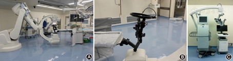 (1)空间大小:复合手术室内设备多且活动性强,手术室所需空间一般应大于常规手术室,一般要求纯手术间的使用面积>70 m2。例如某医院神经血管复合手术室建筑面积120 m2,纯手术间使用面积79 m2。在设定手术间时,应预留一部分空间以便纳入未来更多的血管内治疗、显微外科或其他(如高频聚焦超声)治疗相关设备。(2)层流:手术室必须具备百级洁净度层流条件。(3)储藏室及控制室:神经血管外科复合手术室必需配备有充足的(无菌及非无菌的)储藏室,来储藏显微外科设备、体外循环设备和介入器材等。经屏蔽的控制室也应该包含足够的空间放置所有的手术系统和数据存储系统,便于非无菌的工作人员回顾及处理术中影像数据。(4)吊塔:复合手术室移动设备较多,地面上的管道线路等会给移动设备带来不便,所以要尽量多利用吊塔来提供电力、气体通路及放置小型设备等,例如:麻醉塔和外科设备塔。(5)显示屏设置:神经血管复合手术室背后的理念是影像指导,因此手术室必须配有足够的高质平面屏幕电视监视器,或利用透视、或利用外科显微镜,为所有手术人员提供术前和术中影像。另外十分重要的是,所有手术相关人员都应能看到患者的生命体征及其他术中监测参数。比如手术时往往要控制血压,实时生命体征的可视化就十分重要,突然变化的生命体征往往提醒术者可能存在潜在的并发症。(6)血管造影和介入系统:例如:多轴全方位机器人式血管造影和介入系统(Artis zeego; Siemens AG, Forchheim, Germany)[3](图1)是复合手术室内最为重要的设备。该系统由多轴机器人C臂及手术台构成,能在不移动手术台的情况下进行术中2D/3D造影及DynaCT成像。该系统不但能提供无框架导航及大容量横断面CT成像,更大大方便了血管内治疗与外科手术室的切换,几乎不影响术中麻醉的施行,这点对于复杂神经血管病变手术而言十分重要。(7)可透线床板与头架及其附加系统:神经血管复合手术室的手术台必须满足血管神经外科医生和神经介入外科医生的力学及人体工程学需求,也要考虑到复合手术室整体的布局与流程。碳纤手术台不但能透过射线,并且有足够的强度承受患者及介入设施的重量。碳纤手术台的另一个优势在于对患者和术者的射线暴露少,且图像质量高[4]。对于介入手术,操控台最好在手术台旁,便于简单调控手术台、透视角度和选择有关的功能。对于神经外科手术,手术台最好能在各个平面移动,包括侧向倾斜、头高脚低位。理想情况下,头架应内置有可透过射线的牵开器系统,如DORO可透线手术头部固定系统及附加系统,而传统的牵开器系统不能透过射线。除了手术台旁操控台,必须有另外的可供麻醉师或巡台护士控制术中手术台位置的控制通道,以防手术台旁操控台被器械护士台阻挡。(8)显微镜:神经血管复合手术室要配备高质量的显微镜,为整个手术室提供实时闭路成像。荧光造影技术可以成为有益补充但非必需。(9)术中电生理监测系统:目前神经外科常规应用的术中电生理监测方法包括感觉诱发电位(SEP),运动诱发电位(MEP),听觉诱发电位(BAEP),肌电图(EMG)和术中皮质脑电图监测(ECoG)等。在脑动静脉畸形、胶质瘤等切除术中,术中电生理监测能为避免神经功能损伤提供客观指标,保证手术安全,提高手术效果[5,6]。在颅内动脉瘤夹闭或血管内治疗术中,电生理监测可分析血流情况,指导断流时间,调整手术方式及选择动脉瘤夹大小及夹闭位置[7]。其在脊髓血管疾病中也有应用[8]。