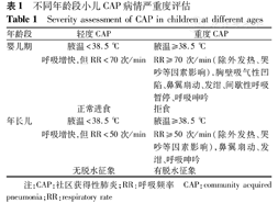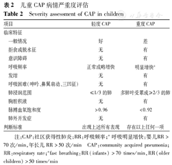 2006年中华医学会儿科学分会呼吸学组参考英国胸科学会观点,结合我国实际情况,拟定重度社区获得性肺炎(community acquired pneumonia,CAP)的标准(表1)[8,9]。