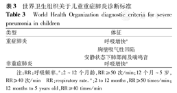 2006年WHO分析了全球5岁以下儿童死亡的构成比,结果显示:儿童肺炎是导致儿童死亡的第一原因,占儿童死亡的19%;其中,因肺炎死亡的儿童90.9%来自于发展中国家[12]。为了降低儿童肺炎的病死率,WHO制定了实用于发展中国家的重症肺炎诊断标准:呼吸增快,并出现胸壁吸气性凹陷或肺部闻及喘鸣,应考虑为重症肺炎(表3)。