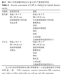 2011年英国胸科协会儿童CAP指南组修订了2002年儿童CAP治疗指南。重症肺炎的诊断标准见表4。