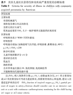 注:FiO2:吸入氧体积分数;pa(O2):动脉血氧分压;≥1项主要指标或≥2项次要指标可考虑为重症肺炎,因需要持续的心肺监测,建议入住重症监护病房治疗 FiO2:fraction of inspired oxygen;pa(O2):partial pre-ssure of oxygen in artery;clinician should consider care in an intensive care unit or a unit with continuous cardiorespiratory monitoring for the child having ≥1 major or ≥2 minor criteria