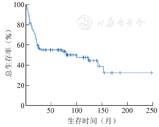 治疗期间52例(52.53%)达CR,11例(11.11%)达到PR,SD和PD有34例(34.34%);随访至2015年12月31日,中位随访时间为32.0(1.0~248.0)个月。至末次随访时间存活48例,死亡51例。1例患者在随访期间罹患第二肿瘤。中位OS期为100.0个月,预期5年OS率为53.50%,10年OS率为44.40%。生存曲线见图1。