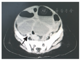 患儿,女,8月龄。因腹泻6 d并腹胀、呕吐1 d以不全性肠梗阻、水盐平衡紊乱收住院。入院前6 d患儿无明显诱因出现腹泻,腹泻物为黄色稀便,每天3~4次,在当地县医院诊断为"肠胃炎" ,予以输液治疗(具体药物不详)但症状无缓解。入院前1 d出现腹胀、呕吐,呕吐物为胃内容物,考虑"肠梗阻"而转来我院。病程中无喂养不当或不洁饮食史,无发热、血便等,食欲不振。体检:T 36.5 ℃,P 130次/min,R 27次/min,体重9 kg。精神萎靡,轻度脱水征,心肺检查未见异常;腹部膨隆,未见胃肠型及蠕动波,腹软,腹部触诊无哭闹,无腹肌紧张,未扪及包块,未引出明显反跳痛,腹中部叩诊呈鼓音;肠鸣音可闻及2次/min,弱而单调,未闻及气过水声;肛门指检未触及包块,退出指套仅粪染无血迹。辅助检查:血常规WBC 12.87×109/L、N 0.68、L 0.25,RBC 4.89×1012/L、Hb 122 g/L、HCT 0.37,PLT 747×109/L,hsCRP>5 mg/L,CRP 20.1 mg/L;电解质K+ 5 mmol/L,Na+ 131 mmol/L,Cl- 91 mmol/L,Mg2+ 1.17 mmol/L,Ca2+ 2.52 mmol/L;肝肾功能正常,大便隐血试验阴性;腹部X线平片、彩色超声及CT平扫均考虑肠梗阻(图1)。入院诊断:婴儿腹泻、轻度脱水、电解质紊乱、急性肠梗阻。