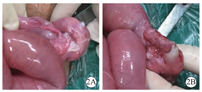 入院后经胃肠减压、补液、补充电解质和营养支持治疗,患儿病情好转,有食欲,哭闹较前减少,精神状态较前有改善,间断有黄色稀便排除。复查腹部X线平片提示肠梗阻治疗后改变影像,与原片对比气液平面数量明显减少。于入院第3天暂停胃肠减压试进食但仍留置胃管,第4天患儿呕吐、腹胀再次出现,复查血常规仅WBC上升(18.01×109/L、N 0.52,L 0.28、RBC 4.7×1012/L、Hb 118 g/L、HCT 0.37),电解质正常,腹部彩色超声提示肠管扩张、右半结肠"同心圆"声像,但腹部未扪及包快,复查大便隐血试验阴性。予禁食等按"肠梗阻"保守治疗继续观察病情变化。患儿仍时有黄色稀便排除,腹胀时显时隐。入院第6天即发病后第12天,患儿腹胀加重,复查腹部彩色超声提示肠管扩张和"同心圆"征仍存在,经保守治疗难以解除梗阻,急诊行剖腹探查术。