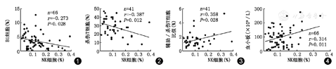 NK细胞占外周血淋巴细胞比例与ITP患者外周血CD3+CD4+T细胞、补体C3、补体C4、血小板抗体(CD41a+IgG、CD41a+IgM)水平、血清IgG、血清IgM、血清IgA、血清IgE、均无明显的相关性(r=-0.033、-0.168、-0.064、-1.380、0.026、-0.085、0.040、-0.007、-0.064,均P>0.05),与B1细胞(CD5+CD19+)呈负相关(n=66,r=-0.273,P=0.028)(图1),与外周血杀伤T细胞(CD3+CD8+)呈负相关(n=41,r=-0.387,P=0.012)(图2),与外周血辅助/杀伤T细胞比值(CD3+CD4+/CD3+CD8+)呈正相关(n=41,r=0.358,P=0.028)(图3),与外周血血小板计数呈正相关(n=66,r=0.314,P=0.011)(图4)。