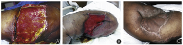A 17-year-old man weighing 157 kg sustained a trauma to his left lateral thigh. The patient was treated at a district hospital conservatively. Then, the patient developed hematoma with skin necrosis over his left lateral thigh. After 3 weeks of dressing and serial debridement, the patient was transferred to our hospital. The left thigh showed a huge degloving area (50 × 70 cm) with a big cavity in the upper pole of the wound. The wound was full of necrotic tissue with foul discharge. Dressing and debridement was made daily for 4 days till the wound showed some improvement. After that, VAC was applied and the dressing was changed every 5 days. The foam was smelly and the collecting fluid in the canister showed pus. Generally, the patient started to improve (no fever, no pain and less edema of the left thigh). After 10 days, the patient was shifted to operating theater for skin grafting secured with VAC. One week postoperatively, the dressing was removed with excellent take of the graft and closure of the cavity. The patient was followed up for 6 months with no complications (Fig. 1).
