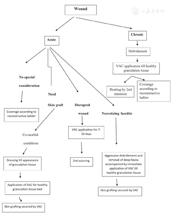 In all acute wounds, VAC was used when granulation tissue started to appear in the wound except in necrotizing fasciitis. In cases presented with necrotizing fasciitis, VAC was applied immediately after debridement. In regard to chronic wounds, the lesion was debrided to refresh the bed and the edges before application of VAC.