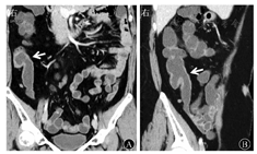 当溃疡穿透至浆膜层时,可形成肠管周围脓肿,表现为肠管周围环形异常强化灶,中央呈液化坏死改变,并可见气泡。瘘管表现为肠管与邻近肌组织形成的管道样结构,管道内壁通常异常强化,并可见气体、液体等肠道内容物影。肠腔狭窄时,可引起肠梗阻,表现为狭窄近端肠管积气、积液扩张,伴有气液平面。肠外并发症在肠结核中较为少见,当出现肠外并发症时,在排除CD后,要考虑是否为肠结核[5]。
