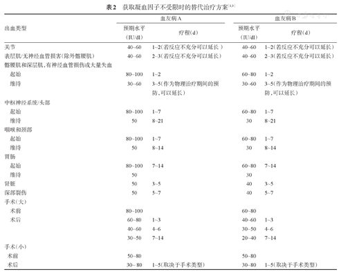 血友病A的替代治疗首选基因重组FⅧ制剂或者病毒灭活的血源性FⅧ制剂,仅在无上述条件时可选用冷沉淀或新鲜冰冻血浆等。每输注1 IU/kg的FⅧ可使体内FⅧ∶C提高2 IU/dl,FⅧ在体内的半衰期为8~12 h,要使体内FⅧ保持在一定水平需每8~12 h输注1次(具体替代治疗方案见表2、表3)。血友病B的替代治疗首选基因重组FⅨ制剂或者病毒灭活的血源性凝血酶原复合物,在无上述条件时可选用新鲜冰冻血浆等。每输注1 IU/kg体重的FⅨ可使体内FⅨ∶C提高1 IU/dl,FⅨ在体内的半衰期约24 h,要使体内FⅨ保持在一定水平需每天输注1次(具体替代治疗方案见表2、表3)。