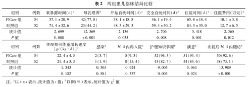 FICare组与对照组比较,氧暴露时间缩短[(57.1±20.9) d比(71.4±32.6) d],母乳喂养率提高(77.8%比44.2%),完全自吮时间缩短[(46.1±19.6) d比(59.4±30.2) d],住院时间缩短[(65.8±18.4) d比(84.3±35.0) d],出院时家长对早产儿基本护理知识和技能的掌握、对护理工作的满意率及出院后30 d内随访率提高,差异均有统计学意义(P<0.05)。