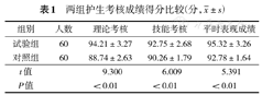 见表1。试验组与对照组护生实习期间理论考核、技能考核、平时表现成绩比较,差异有统计学意义(P<0.05)。