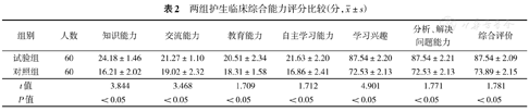 培养护生的交流能力。本结果显示,试验组交流能力具有明显优势。"全程-岗位"双导师在带教过程中个人责任感更强,双导师愿意花费时间和精力与护生沟通,能注重护生的个体特点,做好护生的个性化培养,双导师也可以平时做到言传身教,不断发挥自己榜样的作用[6]。在实施整个临床教学过程中,护生作为"全程-岗位"双导师的纽带,促进了两位导师的沟通,有利于培养护生的沟通能力,丰富了临床带教形式,以达到提高临床带教质量的根本目的[7],同时也催化了教学相长。